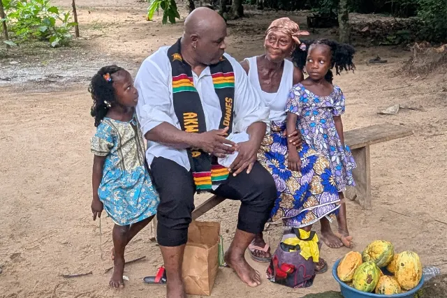Big Tony pauses his journey to sit with an elderly cocoa seller, listening to her experience and honoring her resilience.